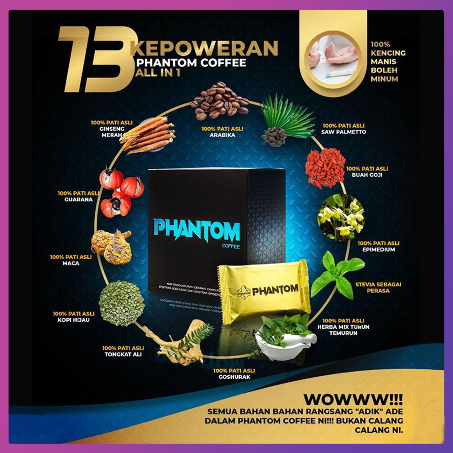 Phantom Coffee telah dikategorikan sebagai BAHAN MAKANAN/MINUMAN. Langsung tiada dadah & apa-apa bahan terlarang. Jadi, gunakan tanpa was-was. Dijamin tiada kesan sampingan. Minum panas-panas memang sedap!